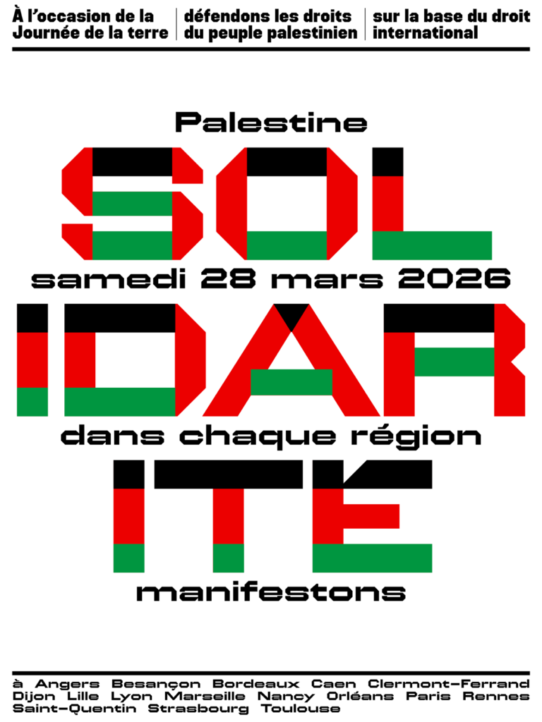 Nous manifesterons dans toutes les régions françaises le 28 mars, à l’occasion de la Journée de la terre, pour la défense des droits du peuple palestinien sur la base du droit international.