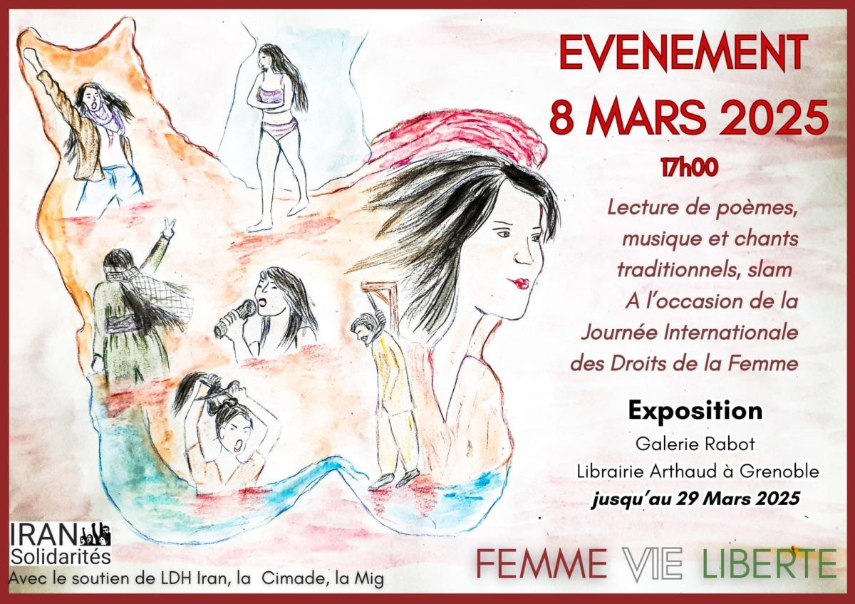 Le groupe local de Grenoble soutient l’évènement organisé par l’association Iran Solidarité, à l’occasion de la journée internationale des droits des femmes : Poésie, musique, chants traditionnels et slam samedi 8 mars à 17h. Soyons nombreuses et nombreux pour soutenir et rendre hommage à la lutte des femmes iraniennes !