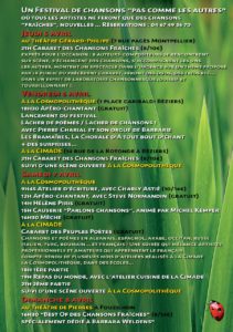 Associer à ce festival des chansons fraîches- le cabaret des peuples poètes – chansons et poèmes en albanais, russe, occitan, espagnol, roumain, turc, français…..Travail sur des textes de chansons et écriture de poèmes – fruit de plusieurs mois d’ateliers avec les apprenants des cours de français. soirée qui mélange artistes professionnels et amateurs qui apprennent le français.