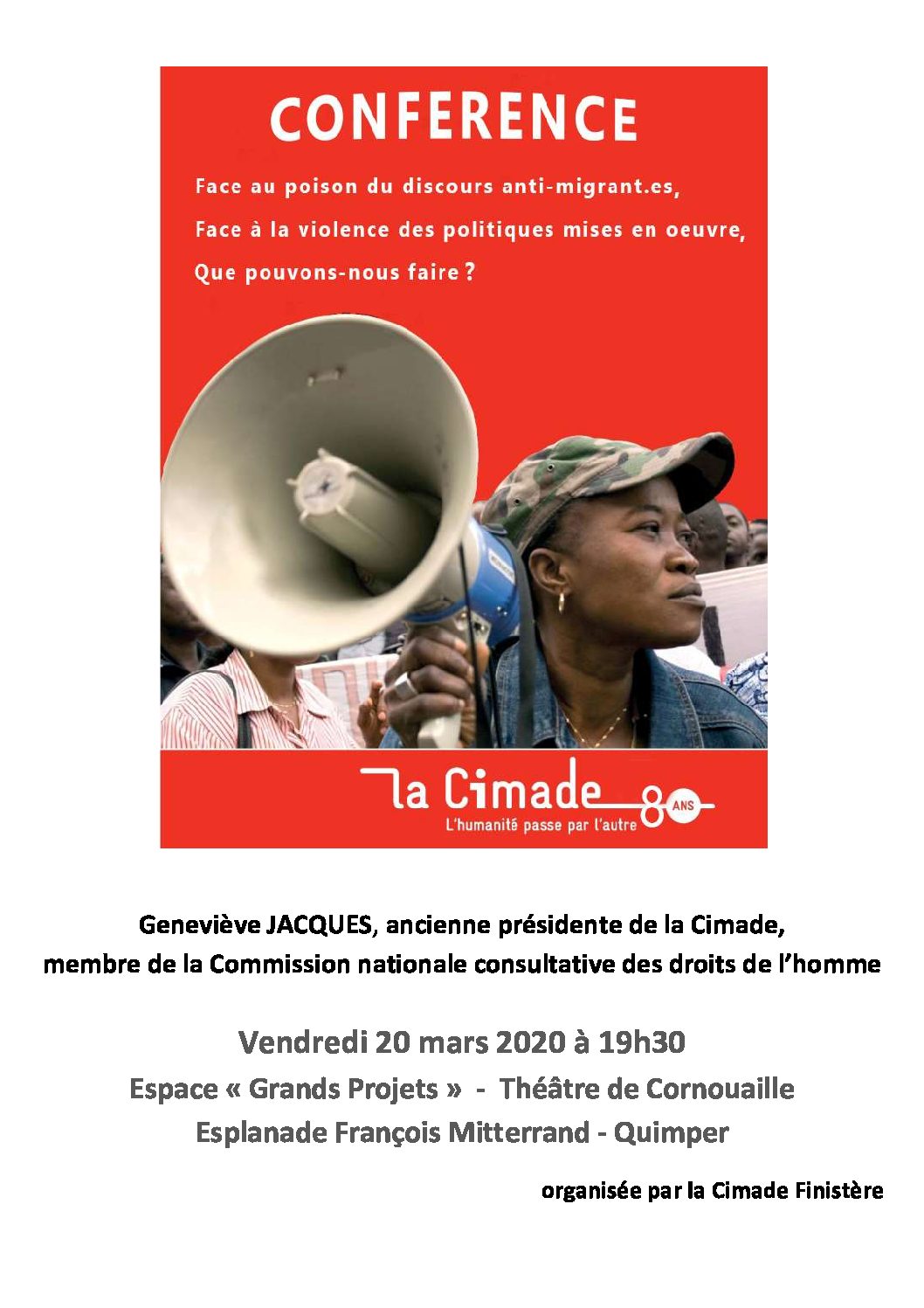 A l’occasion des 80 ans de la Cimade, nous avons le plaisir de vous inviter à la conférence que donnera Geneviève JACQUES, ancienne présidente de la Cimade, membre de la Commission nationale consultative des droits de l’homme