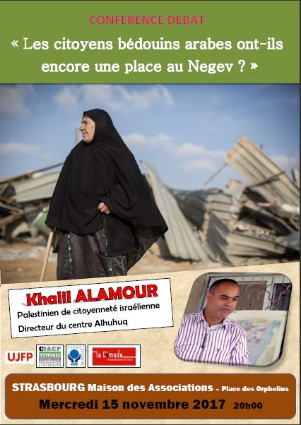 Mr K.A. bédouin, citoyen israélien, avocat, est co-directeur du centre Alhuquq (legal rights center for beduins community in Israël- alhuquq signifie droits en arabe). Il viendra nous présenter les diverses actions (locales-nationales et internationales) et objectifs pour la protection de leurs droits juridiques-sociaux-humains-économiques et civiques.