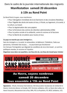 La journée internationale des migrant.es a été proclamée par l’Assemblée générale des Nations Unies le 4 décembre 2000 (résolution 55/93). En 2025, à travers la Normandie, La Cimade appelle et soutient des mobilisations organisées avec nos partenaires locaux dans le cadre de deux appels nationaux.