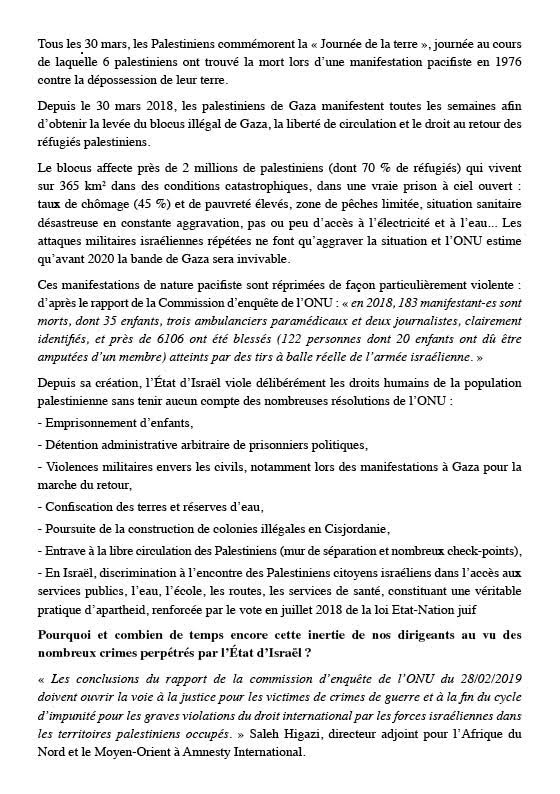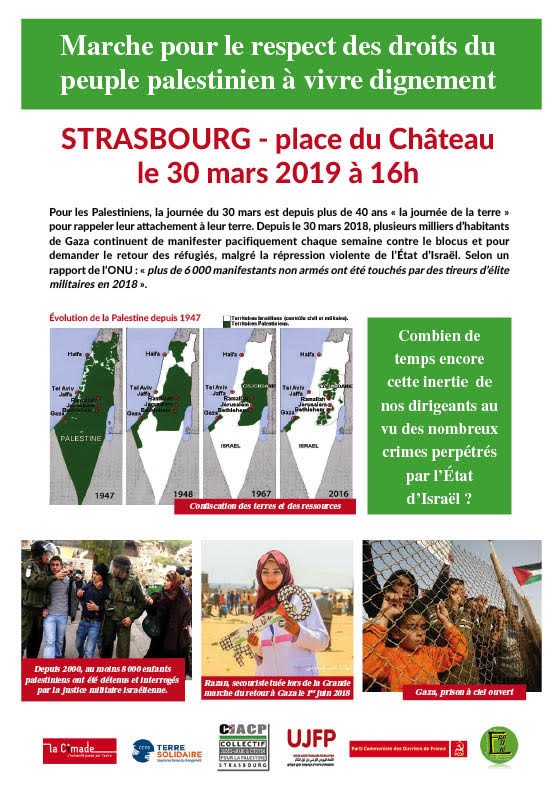 Pour les palestiniens la journée du 30 mars est depuis plus de 40 ans « la journée de la terre » pour rappeler leur attachement à leur terre. Depuis le 30 mars 2018, plusieurs milliers d’habitants de Gaza continuent de manifester pacifiquement chaque semaine contre le blocus et pour demander le retour des réfugié(e)s, malgré la répression violente de l’Etat d’Israël. Selon un rapport de l’ONU « plus de 6000 manifestants non armés ont été touchés par des tireurs d’élites militaires en 2018 ».