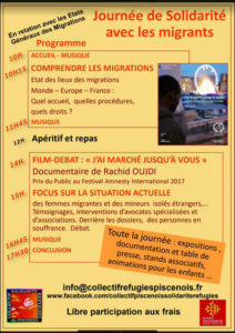 Journée « D’ici et d’ailleurs, tous humains et solidaires » de 10 h à 18 h avec table-rondes, projection du film « J’ai marché jusqu’à vous » de Rachid OUJDI et temps musicaux, proposée par le Collectif Solidarité Réfugiés du