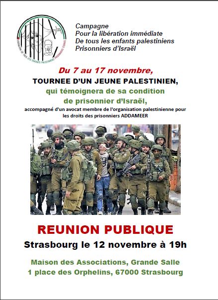 Réunion publique le 12 novembre à 19h à la Maison des associations de Strasbourg – Témoignage d’un jeune palestinien de sa condition de prisonnier d’Israël, accompagné d’un avocat membre de l’organisation palestinienne pour les droits des prisonniers ADDAMEER.