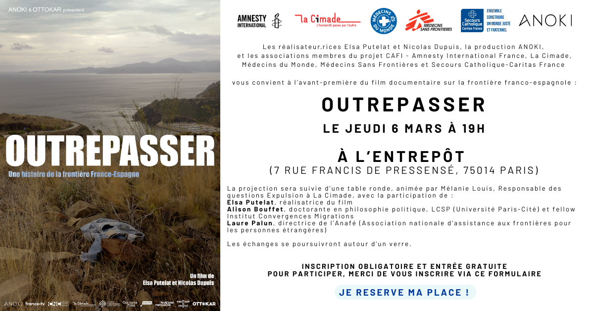 Le 06 mars 2025, à L’Entrepôt (7 Rue Francis de Pressensé 75014 Paris, France) à 19h, les réalisateur·rices Elsa Putelat et Nicolas Dupuis, la société de production ANOKI, et les associations membres du projet CAFI*, vous convient à l’avant-première du film documentaire sur la frontière franco-espagnole : Outrepasser (52 minutes).