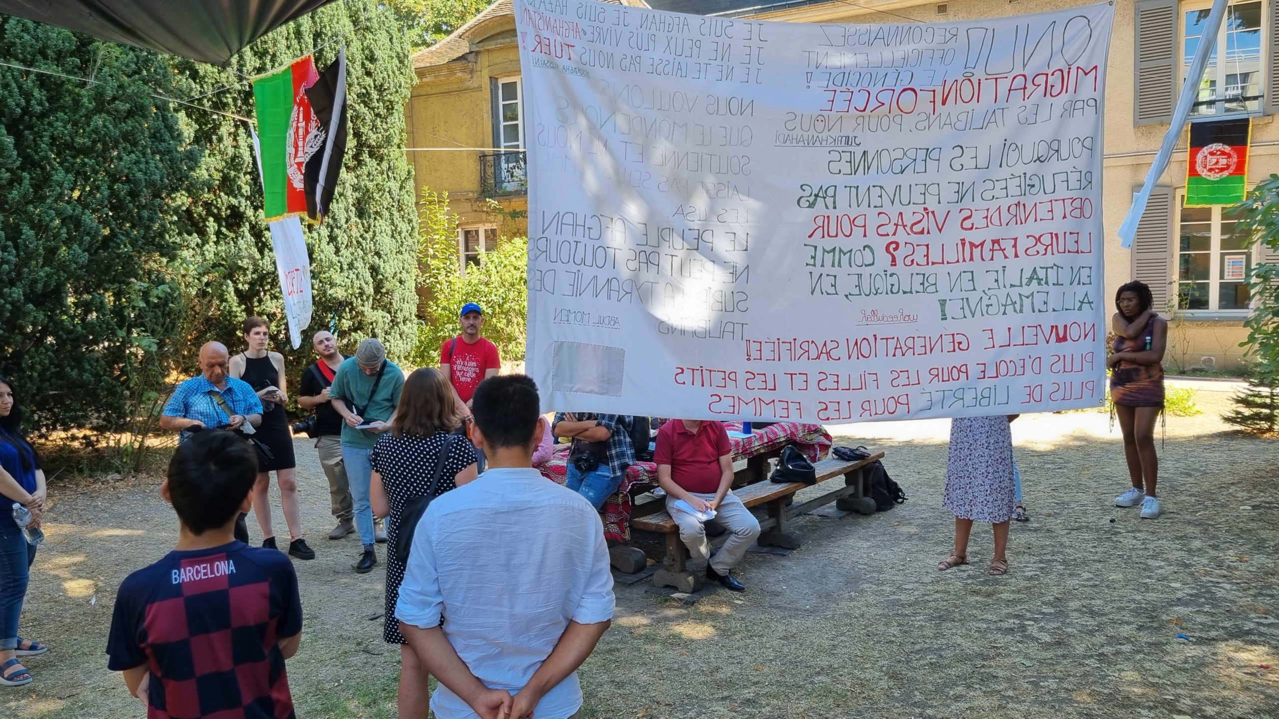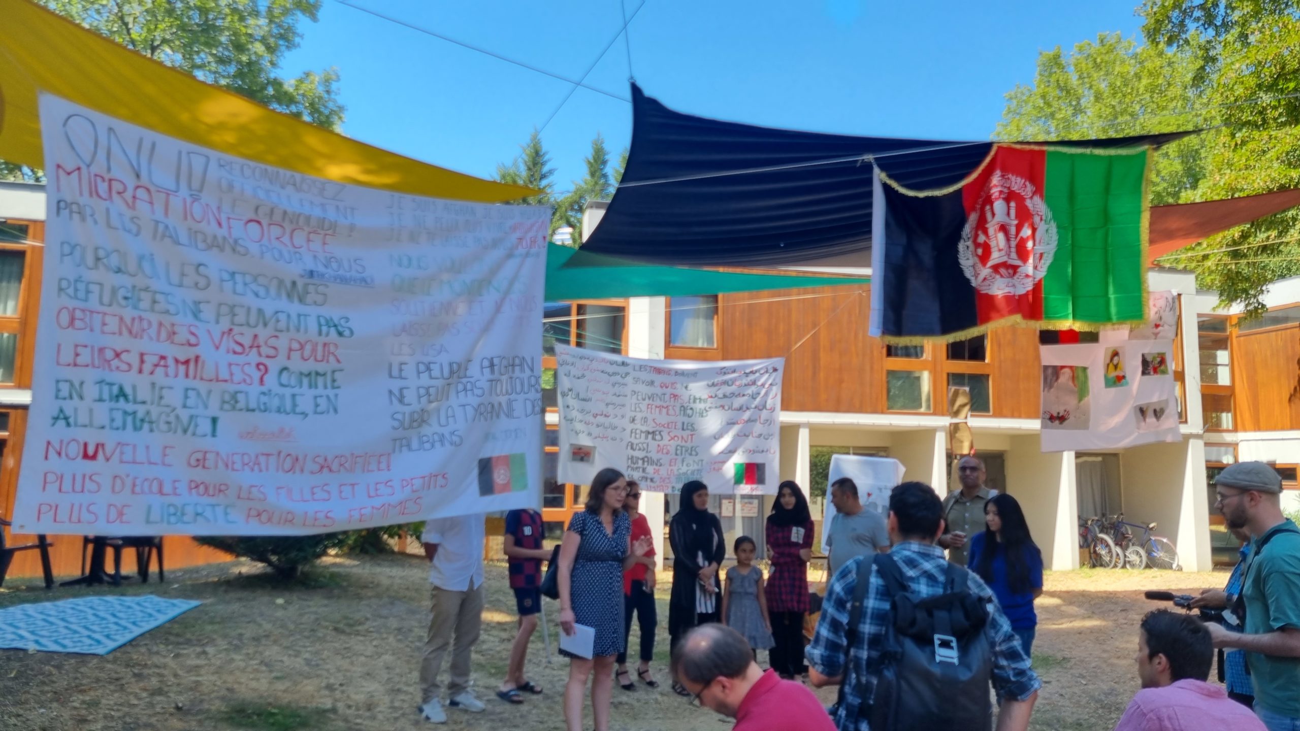 « L’idée de faire des banderoles et de témoigner à la presse est venue des réfugié·e·s pour continuer à lutter ici, pour que l’Afghanistan ne tombe pas dans l’oubli, pour parler de la violence des Talibans et de la violence de l’exil, notamment des traitement inhumains et dégradants subis par les exilés afghans en Iran et pour dénoncer aussi la politique restrictive de la France en matière de délivrance de visas », a souligné Julie Beraud, chargé de projet au centre de Massy.
