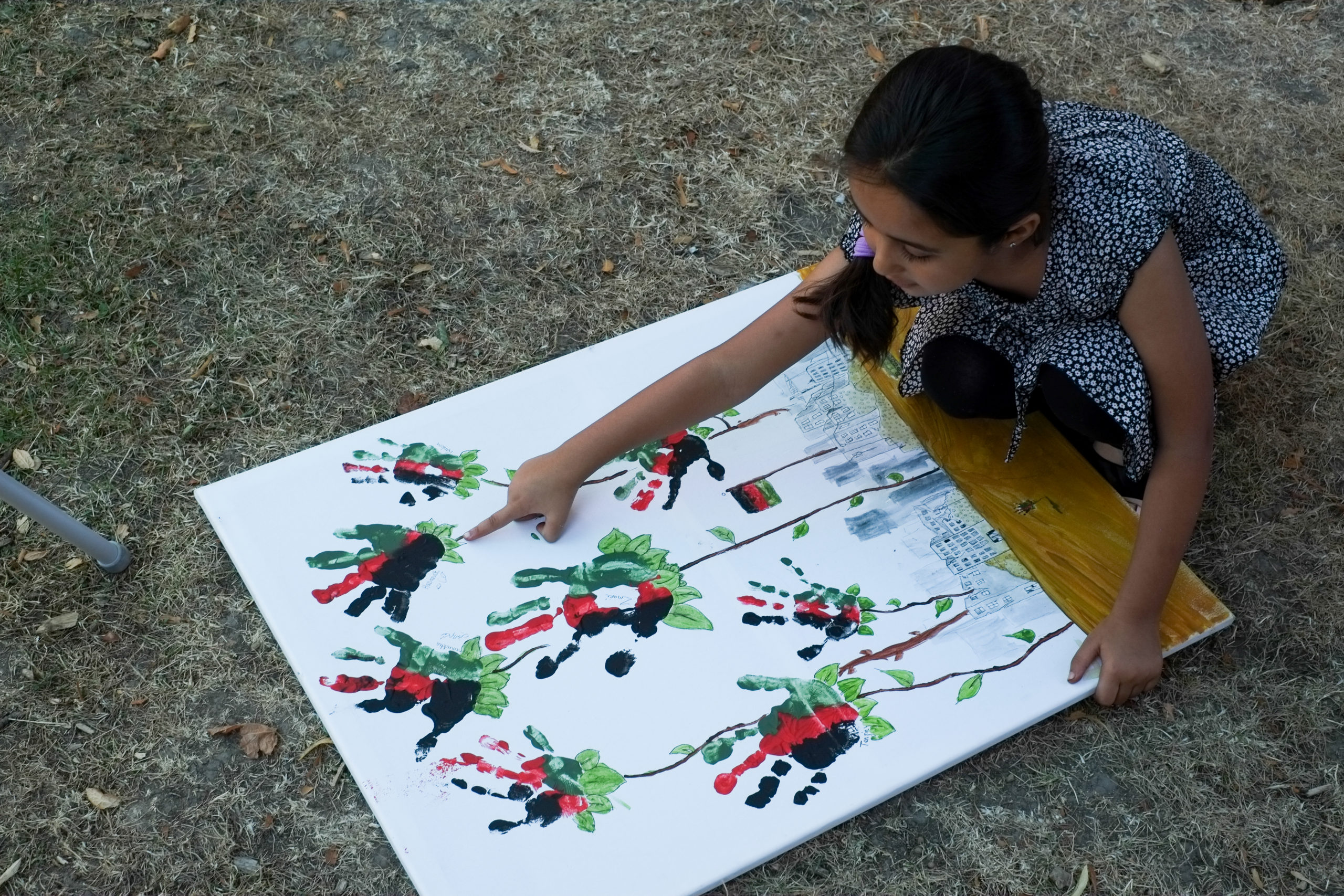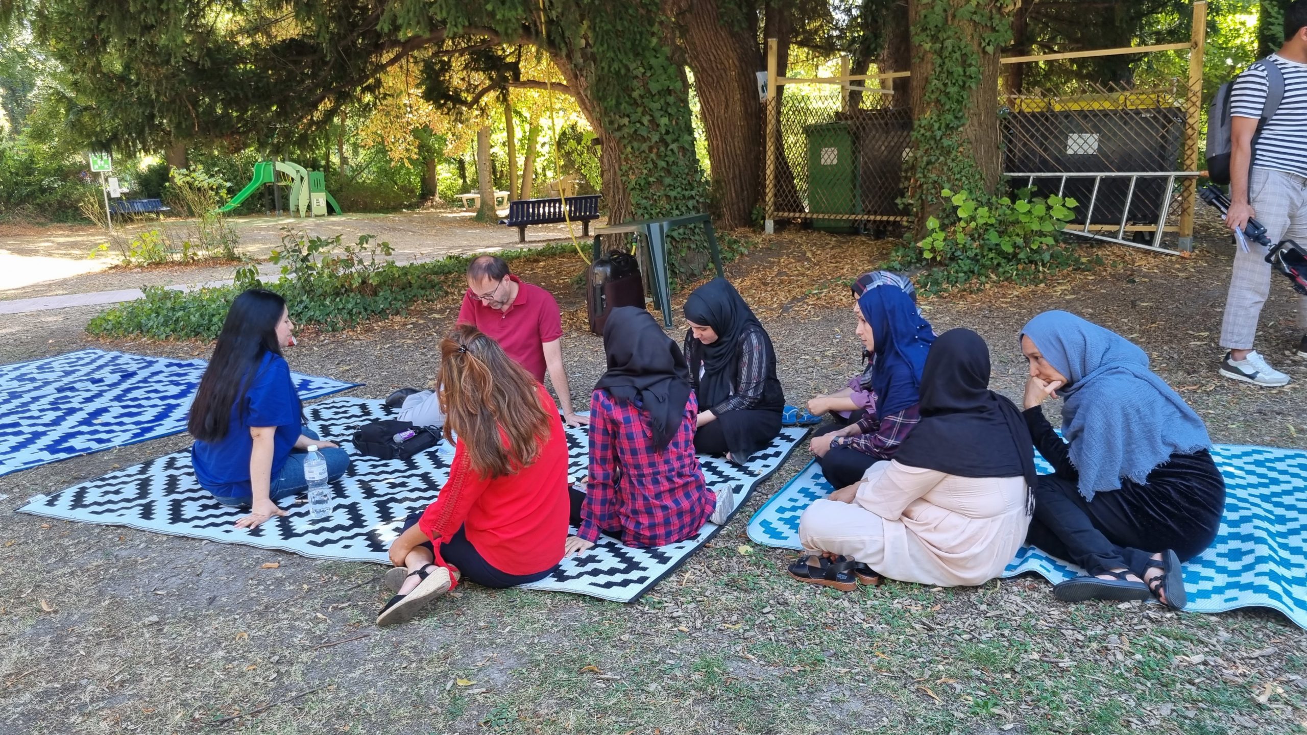 Des banderoles et des dessins aux couleurs du drapeau afghan contrastent avec la verdure du jardin du centre international. A cette occasion une vingtaine des résident·e·s se sont donné·e·s  rendez-vous pour témoigner à la presse de leurs parcours de vie, de ce que vivent leurs proches restés en Afghanistan, ainsi que leurs craintes sur l’accès aux droits des femmes sur place.