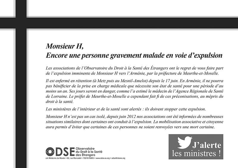 Les associations de l’Observatoire du Droit à la Santé des Étrangers ont le regret de vous faire part de l’expulsion imminente de Monsieur H vers l’Arménie, par la préfecture de Meurthe-et-Moselle.
