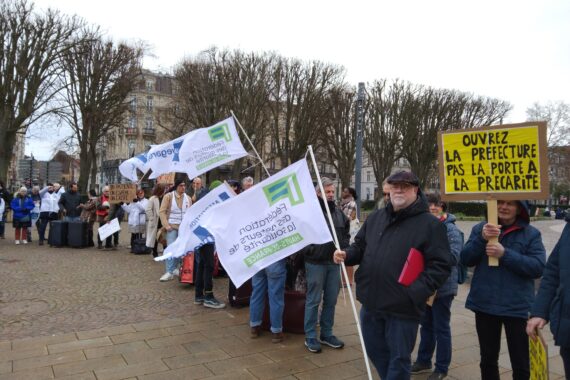 Au regard des délais particulièrement longs d’audiencement (2 à 3 ans), nous étions ce jeudi 18 décembre une trentaine d’organisations à appeler à une action symbolique afin de visibiliser les difficultés rencontrées par de nombreuses personnes étrangères dans leurs démarches de titre de séjour, ainsi que l’attente et les ruptures de droits qui en découlent FLYER 18 DEC.