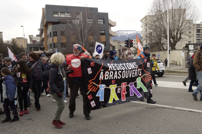 Après son assemblée locale du 13 janvier centrée sur cette loi, la Cimade Hautes-Alpes s’est tout entière mobilisée en réutilisant les nappes pour faire des banderoles « Il n’y a pas pas d’étrangers sur cette terre » accrochées sur les grilles de la Préfecture, en défilant avec les panneaux « Code de la Honte » et au verso les affichettes « Stop à la désinformation, en distribuant largement autocollants et le petit guide « les Préjugés sur les personnes étrangères ».