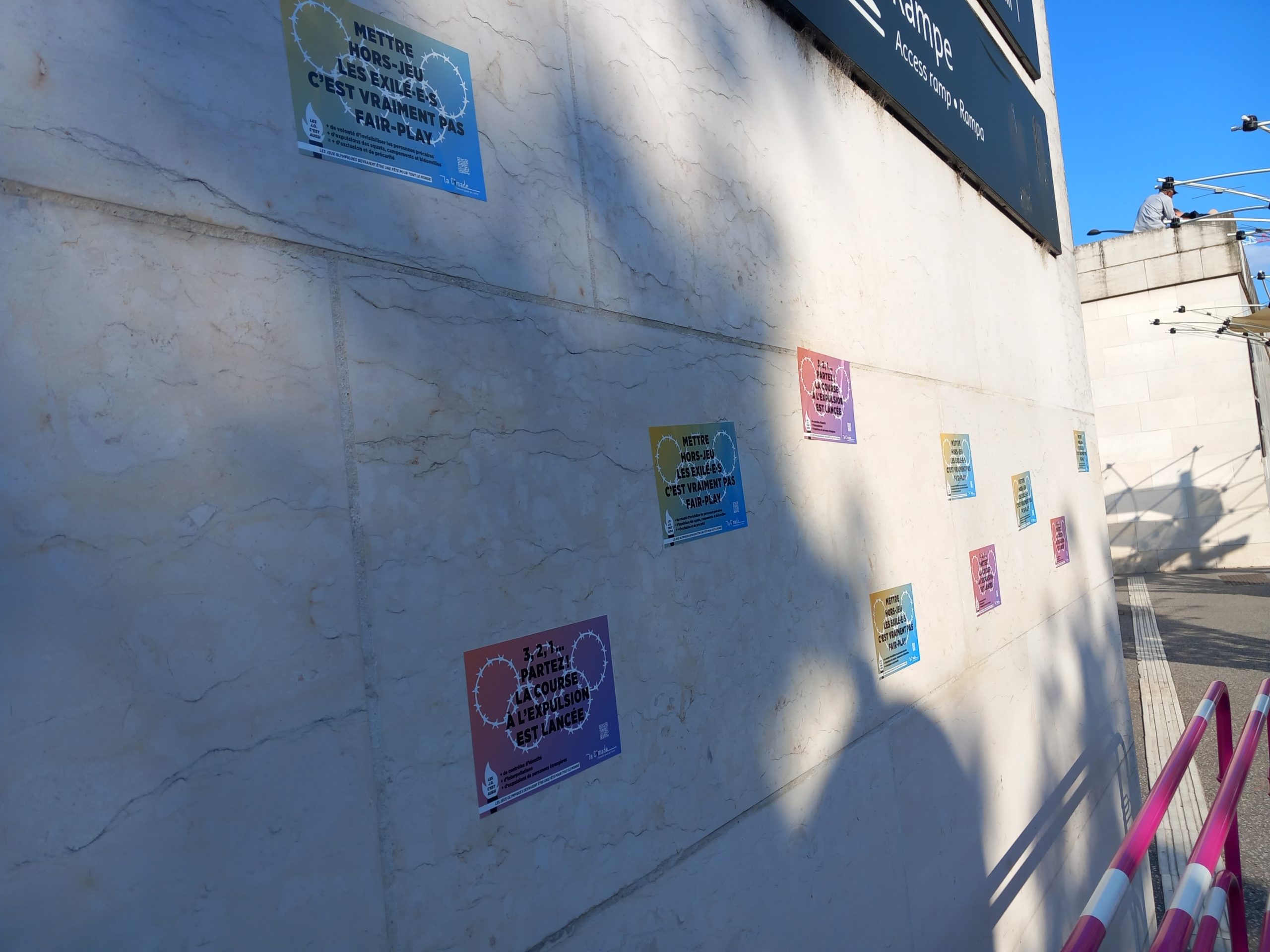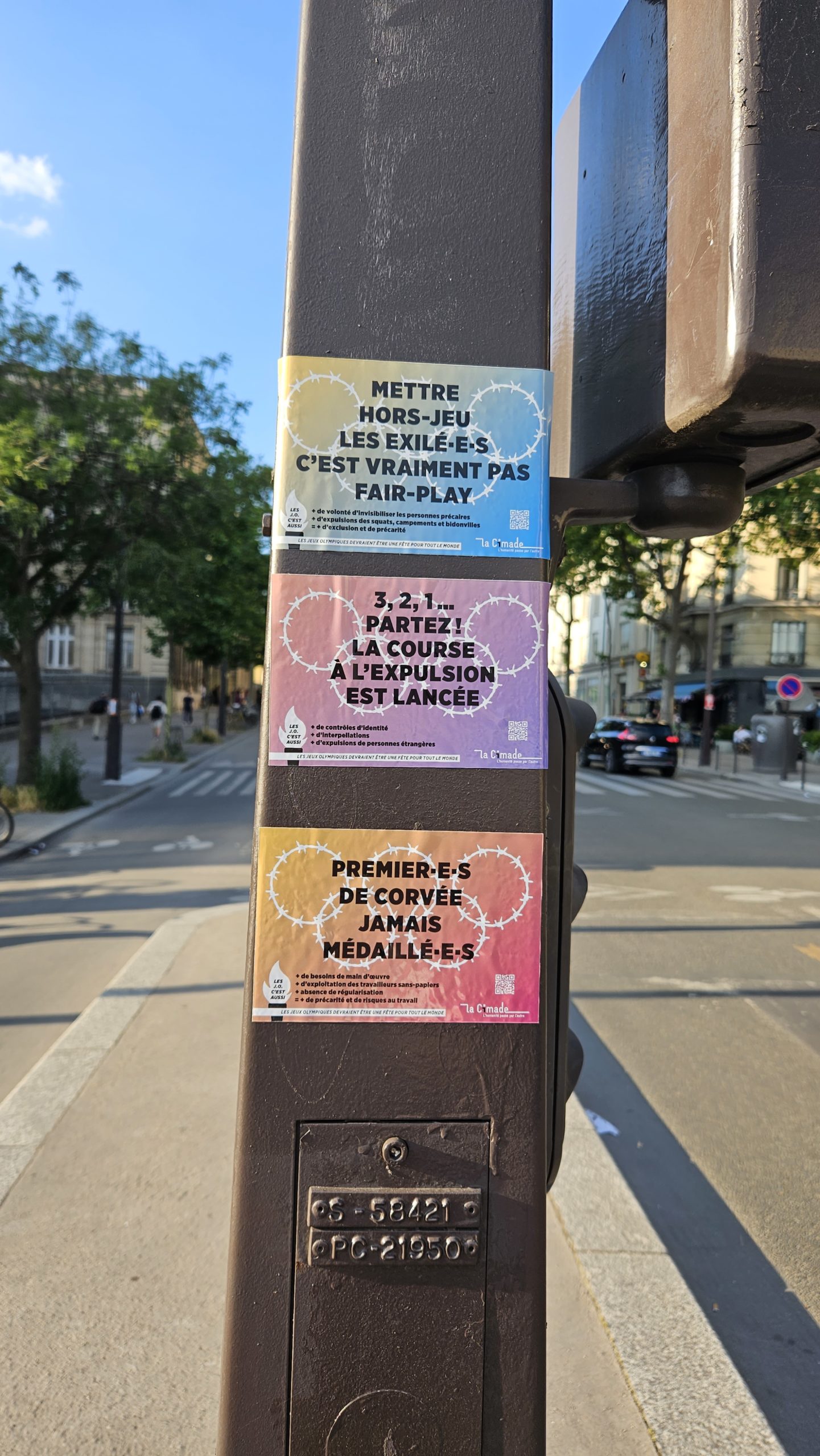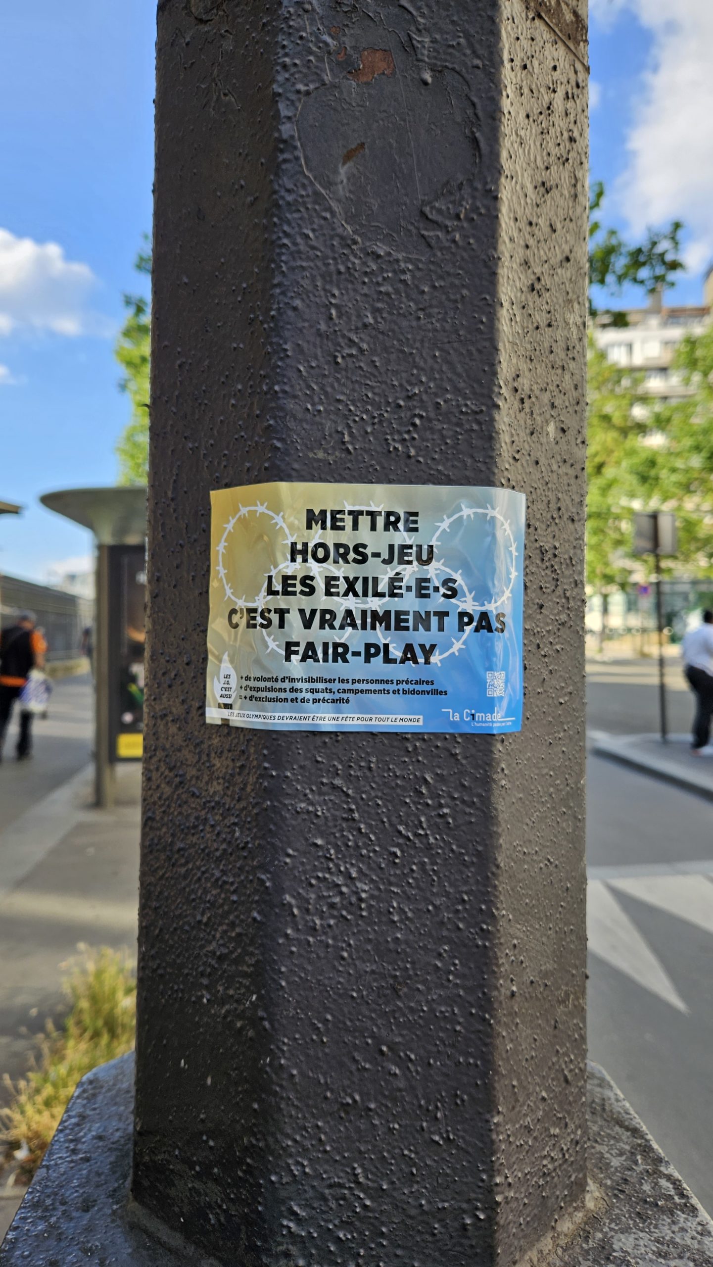 Afin de sensibiliser le grand public à la situation des personnes exilées en cette période de Jeux Olympiques, La Cimade a lancé des opérations de collage de stickers dans l’espace public pour interpeller les passant.e.s et faire entendre ses revendications.