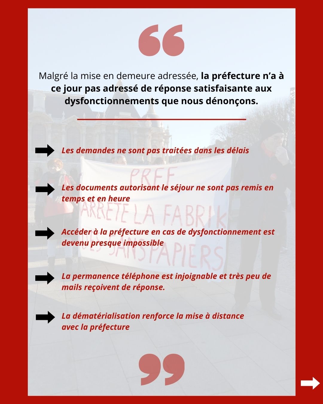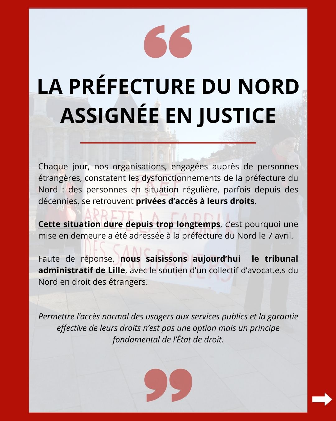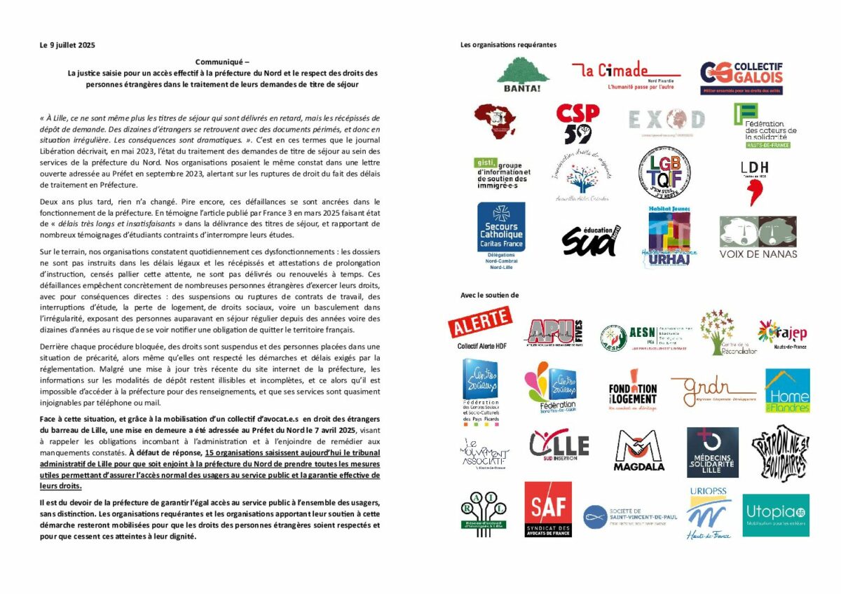 Face à cette situation, et grâce à la mobilisation d’un collectif d’avocat.e.s en droit des étrangers du barreau de Lille, une mise en demeure a été adressée au Préfet du Nord le 7 avril 2025, visant à rappeler les obligations incombant à l’administration et à l’enjoindre de remédier aux manquements constatés. À défaut de réponse, 15 organisations saisissent aujourd’hui le tribunal administratif de Lille pour que soit enjoint à la préfecture du Nord de prendre toutes les mesures utiles permettant d’assurer l’accès normal des usagers au service public et la garantie effective de leurs droits.