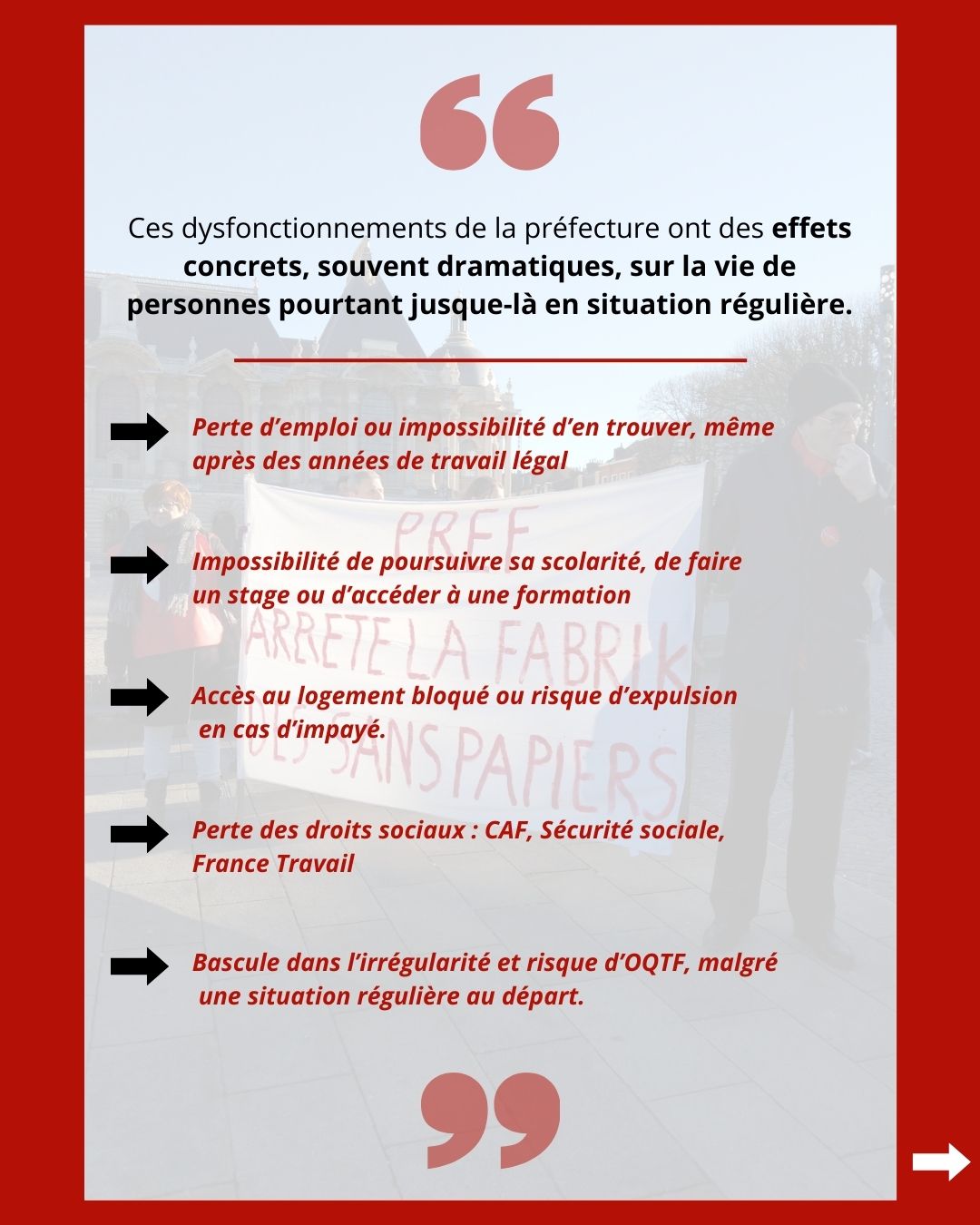 Sur le terrain, nos organisations constatent quotidiennement ces dysfonctionnements : les dossiers ne sont pas instruits dans les délais légaux et les récépissés et attestations de prolongation d’instruction, censés pallier cette attente, ne sont pas délivrés ou renouvelés à temps. Ces défaillances empêchent concrètement de nombreuses personnes étrangères d’exercer leurs droits, avec pour conséquences directes : des suspensions ou ruptures de contrats de travail, des interruptions d’étude, la perte de logement, de droits sociaux, voire un basculement dans l’irrégularité, exposant des personnes auparavant en séjour régulier depuis des années voire des dizaines d’années au risque de se voir notifier une obligation de quitter le territoire français.