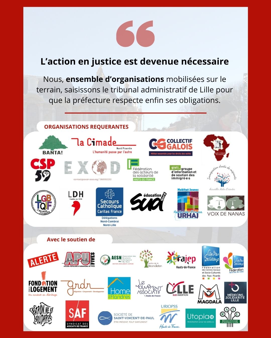 15 organisations dont La Cimade saisissent le tribunal administratif face aux dysfonctionnements en Préfecture de Lille, avec le soutien de 20 autres organisations