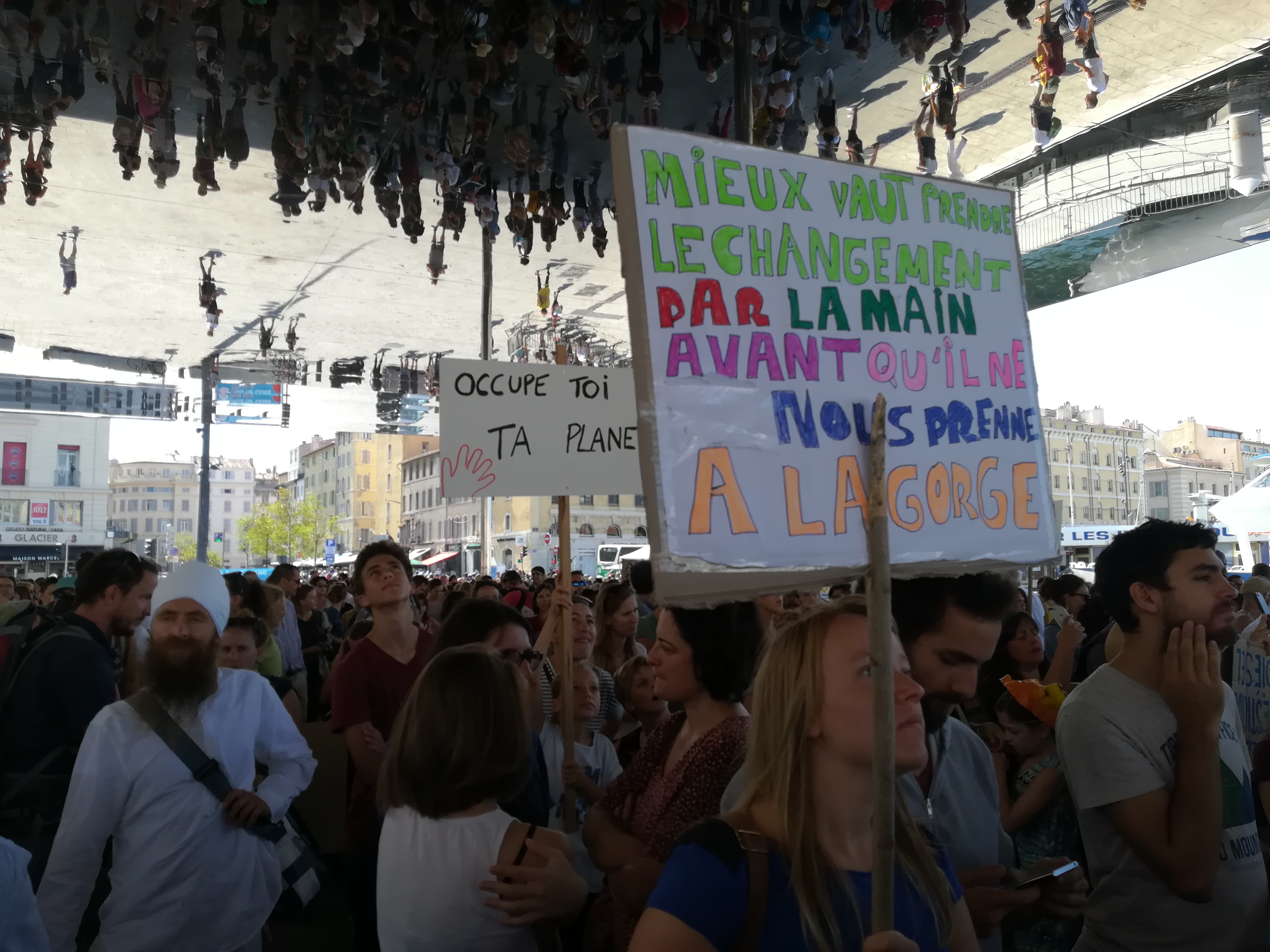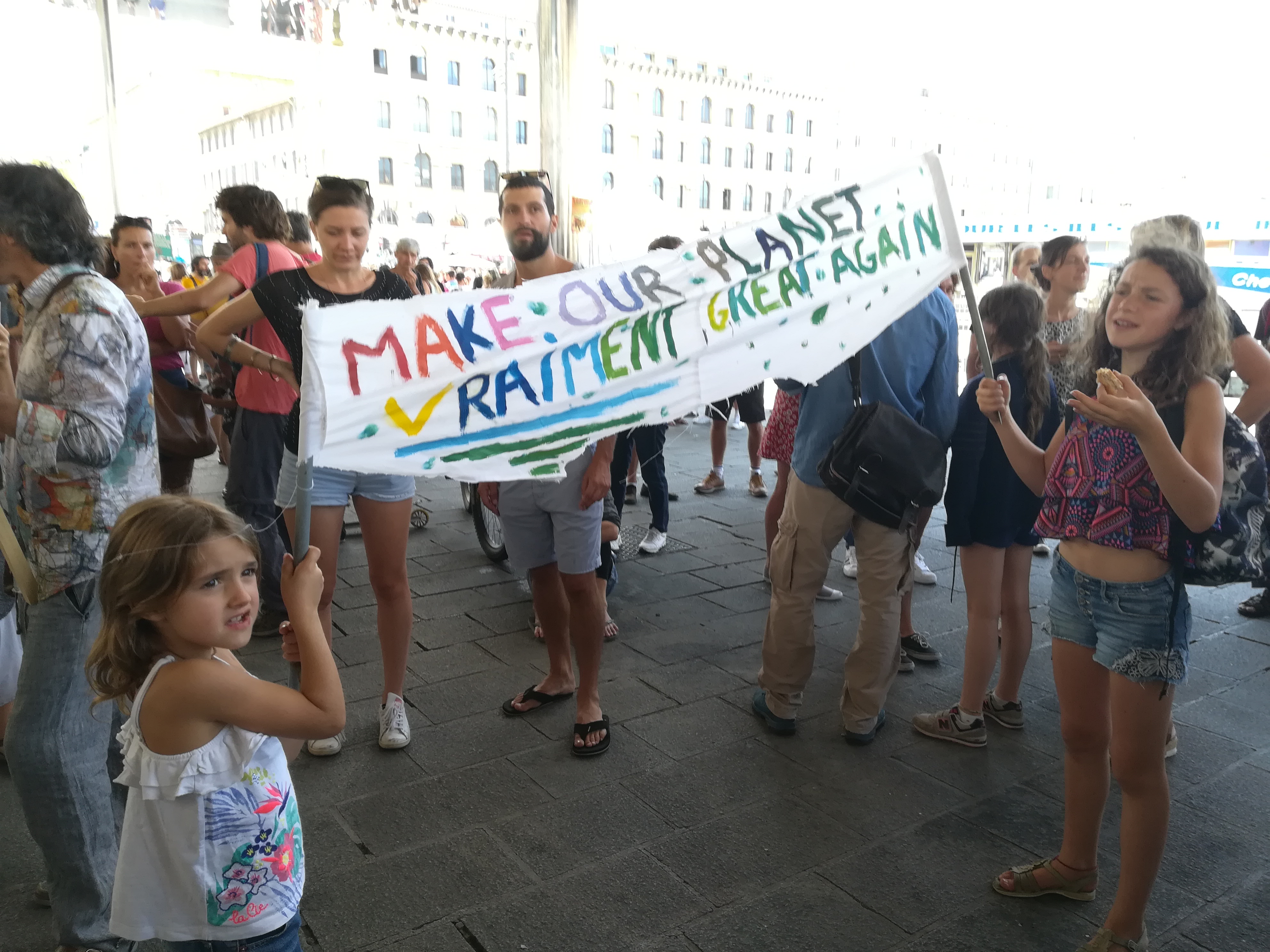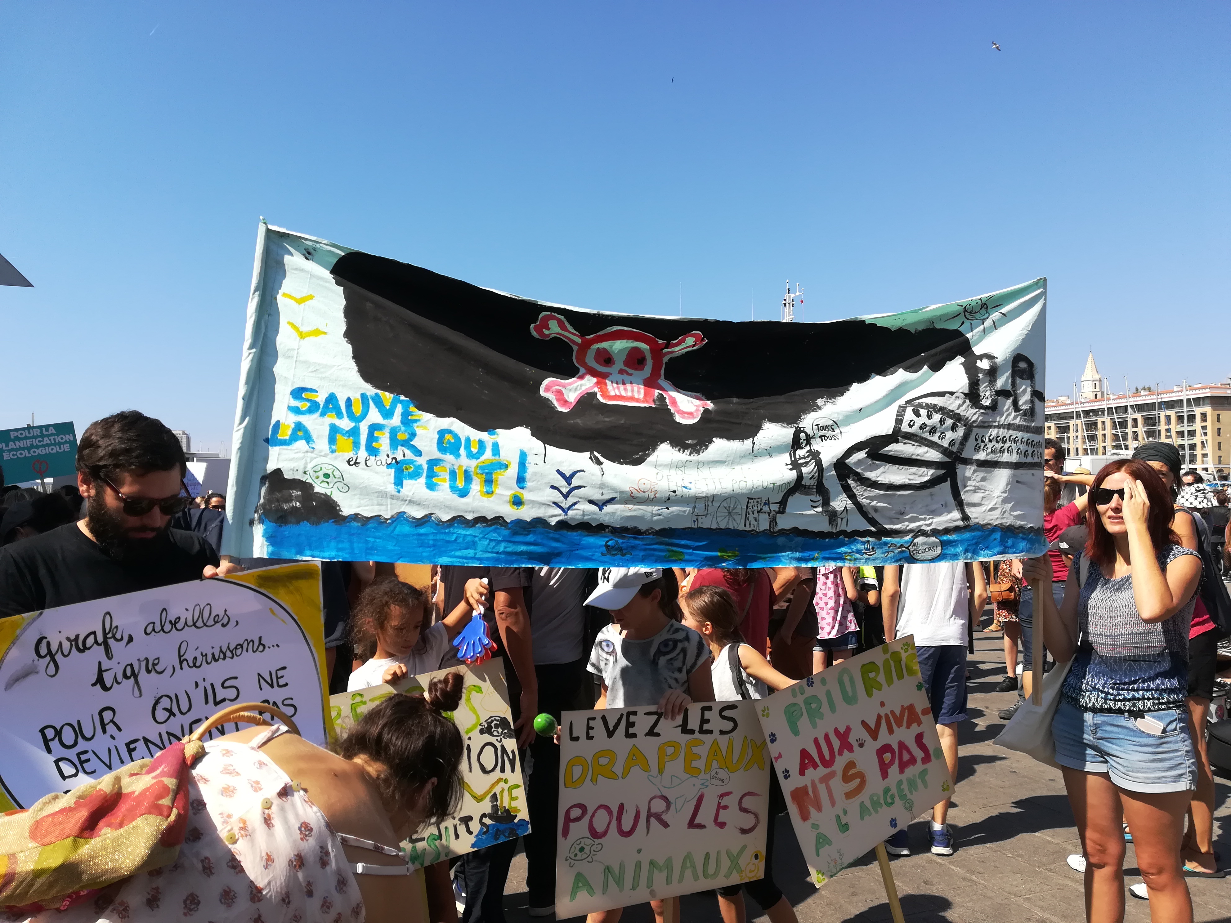 Forte mobilisation ce 8 septembre au Vieux-Port pour la Marche Pour le climat. Beaucoup de pancartes « faites maison », et beaucoup de très jeunes manifestants.
