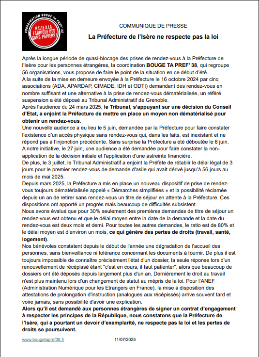 Le Tribunal administratif de Grenoble a donné raison aux associations en mars 2025, en ordonnant la mise en place d’un dispositif non dématérialisé de prise de rendez-vous. Mais plutôt que de se conformer à la décision de justice, la Préfecture a tenté de faire croire à l’existence d’un tel accueil… qui, sur le terrain, est inexistant. Cette tentative de contourner l’injonction a été rejetée par le Tribunal administratif début juin.