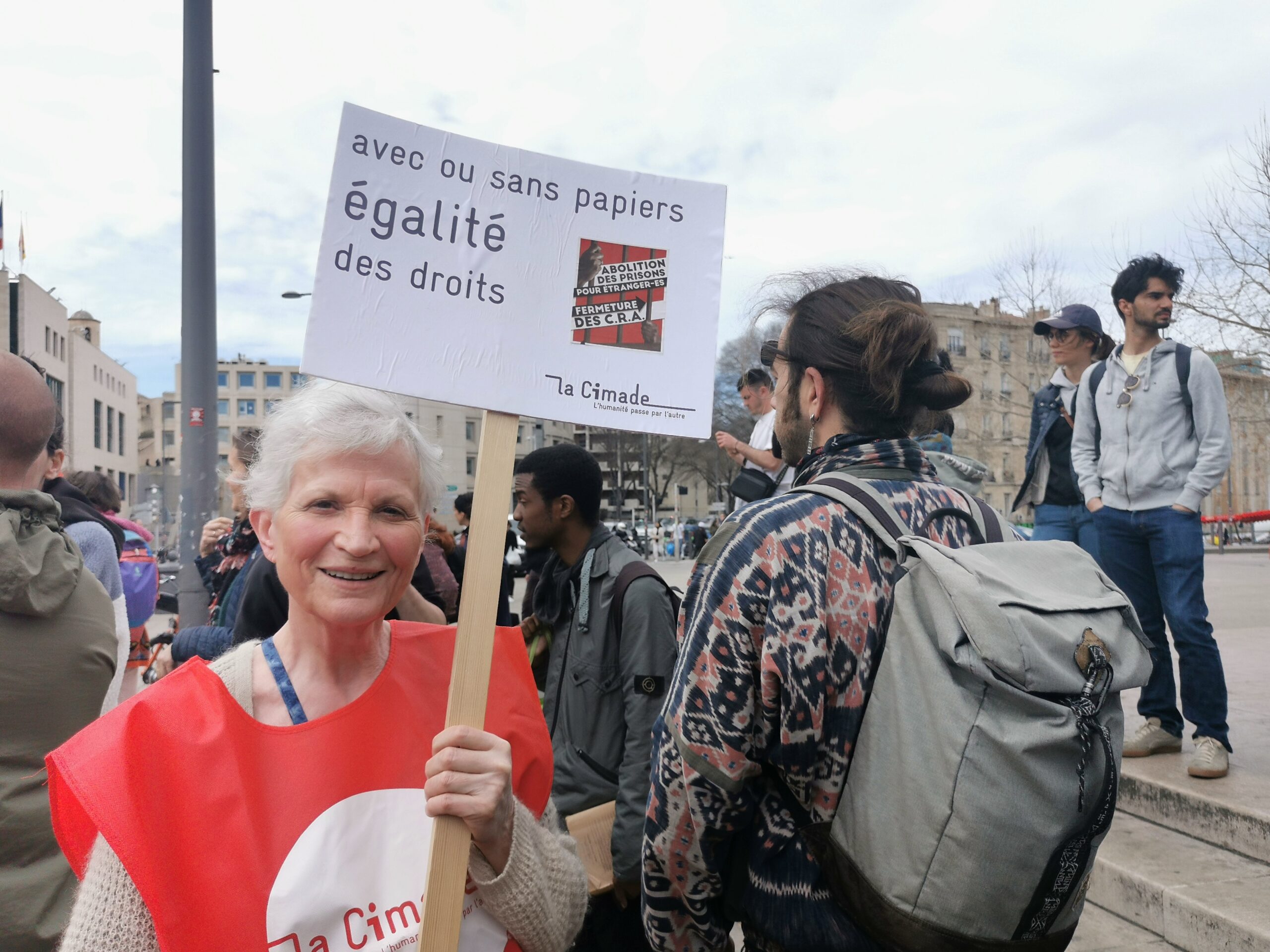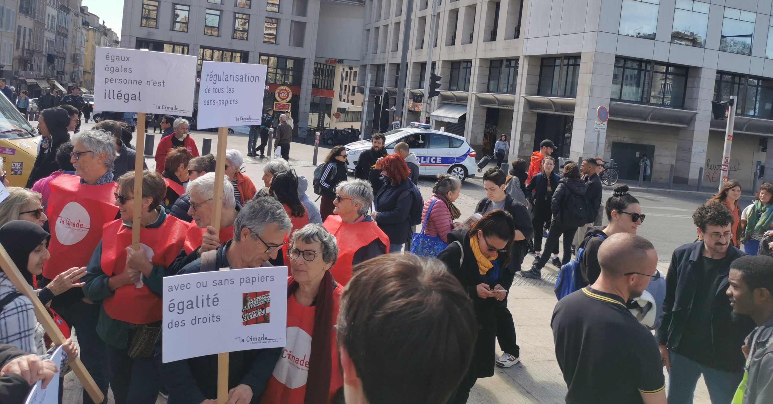 La Cimade était là ce samedi matin, à la Porte d’Aix, pour revendiquer « une régularisation large, durable, et immédiate pour toutes et tous, afin de respecter leurs droits fondamentaux et de construire l’égalité des droits, ainsi que la liberté de circulation et d’installation. »