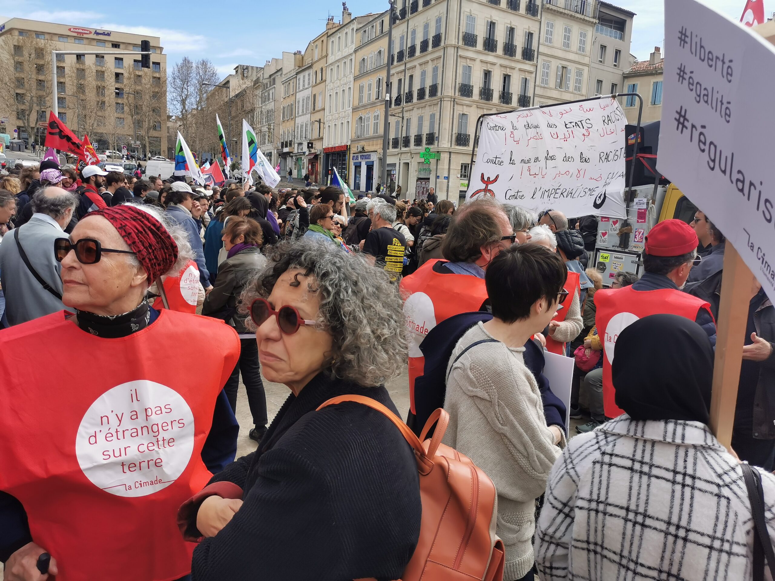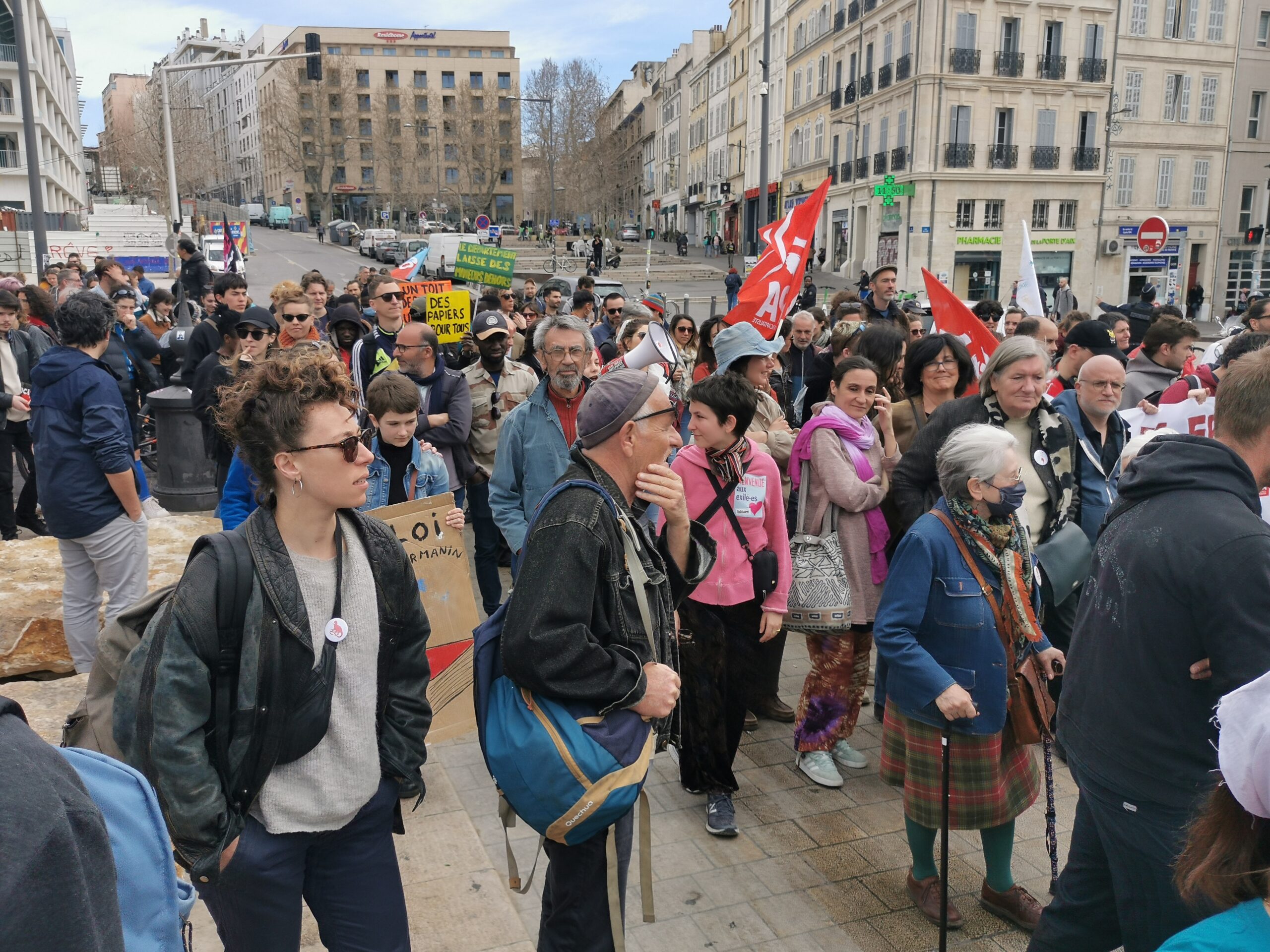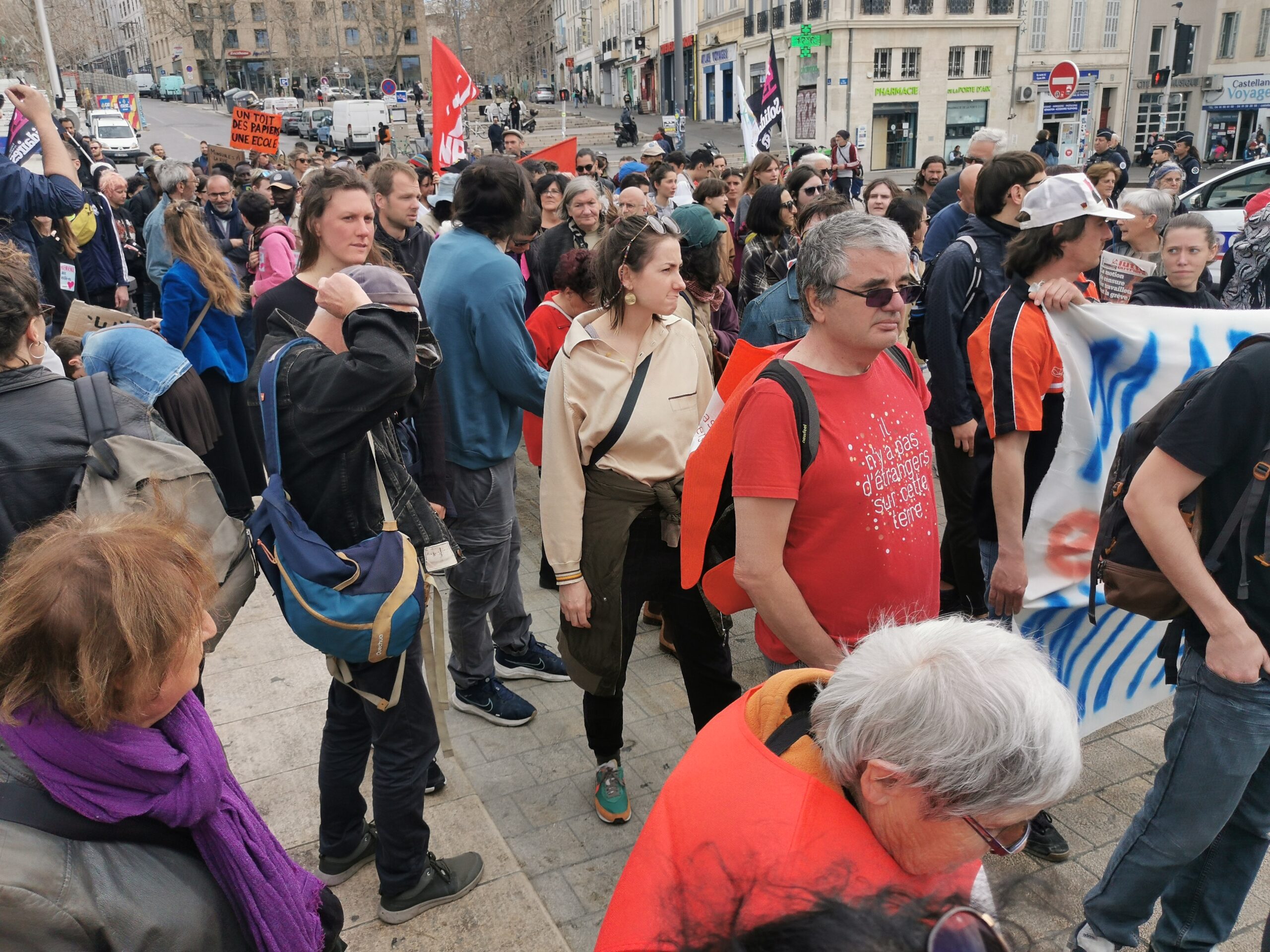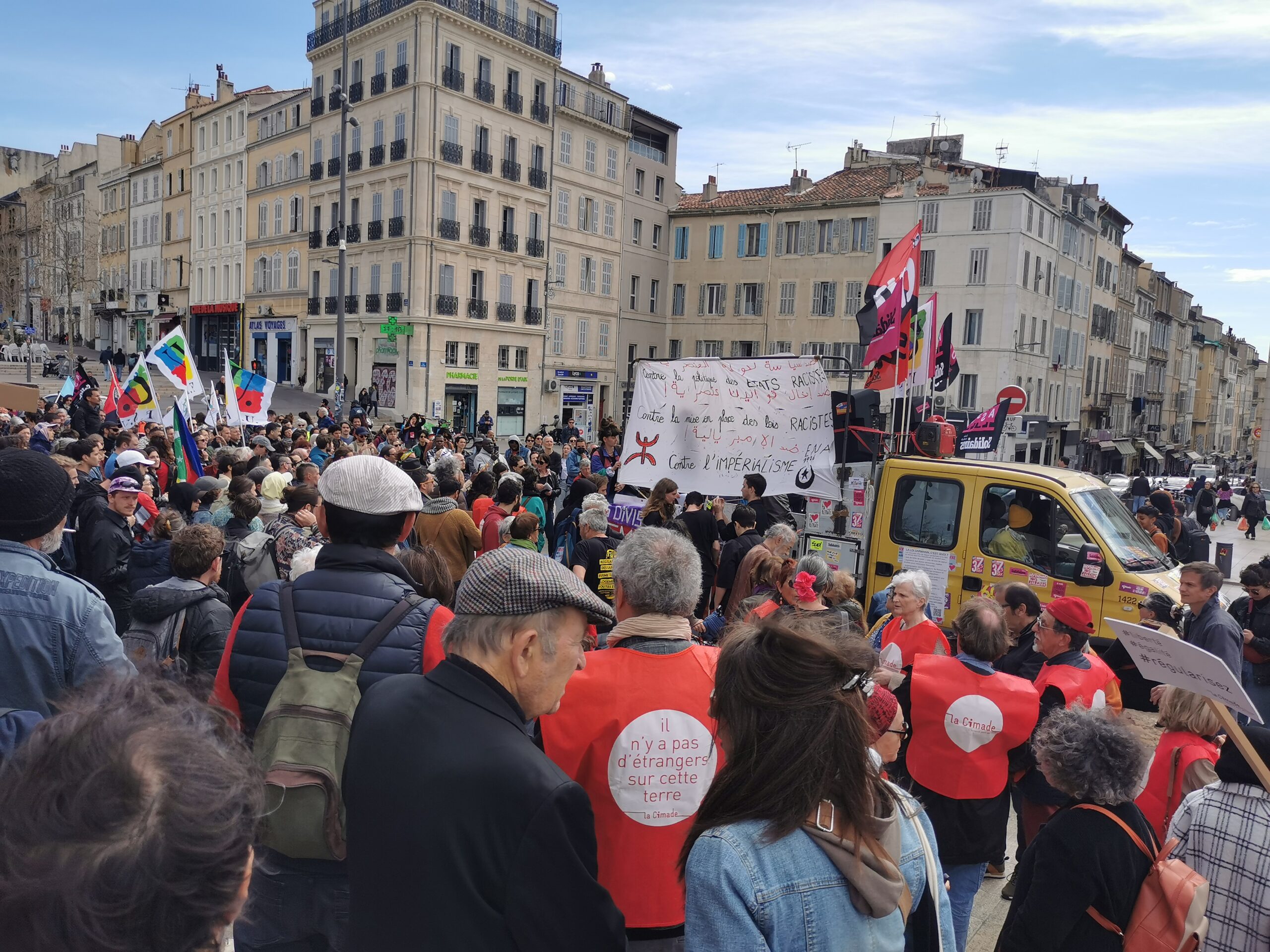 Ce samedi 25 mars, à Marseille, la mobilisation contre la loi Darmanin était massive. Même si l’examen du projet de loi a été reporté sine die, la vigilance de la société civile est démontrée : nous ne laisserons pas se dégrader encore la condition des personnes étrangères en France.