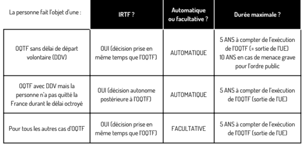 ⇨ En somme, la durée de l’IRTF est de 5 ans maximum à compter de l’exécution de l’OQTF et 10 ans maximum en cas de menace grave pour l’ordre public