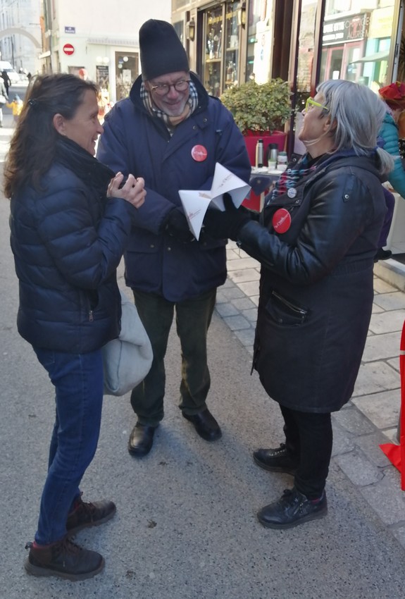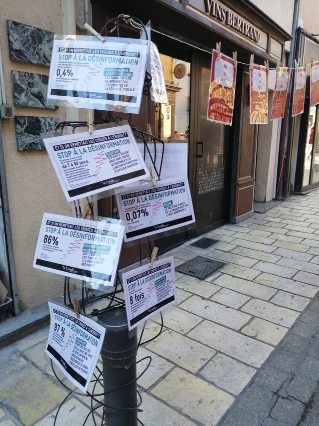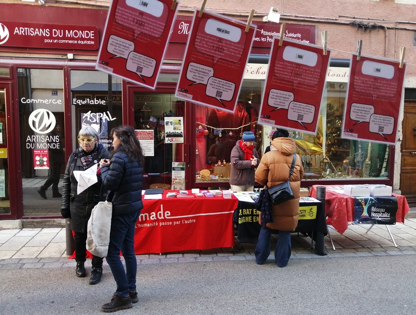Le samedi 16 décembre, jour de marché et de courses pour Noël à Gap, la boutique équitable « E’Changeons Le Monde » a invité la Cimade, Amnesty International et le Réseau Hospitalité devant ses portes pour dire notre opposition à la loi Darmanin et pour réaffirmer notre revendication de régularisation. La Cimade a exposé son arbre de la désinformation et sa colonne d’affiches tandis que les équipier·es proposaient la cocotte-quizz géante sur la régularisation aux passant.es.