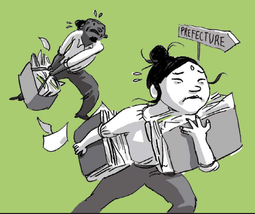 L’employée revient avec une page imprimée que M.O reconnaît immédiatement pour être l’annexe 10 du CESEDA qu’elle l’avait envoyée consulter. L’annexe 10 établit la liste des documents à fournir pour toute demande de carte de séjour, mais ne dispose pas les conditions nécessaires à leur obtention. Dans l’annexe 10 figure la précision suivante : pour prouver que des parents ont vécu en France pendant 5 ans avec un enfant qui lui même a prouvé qu’il a vécu en France pendant 5 ans avec des certificats scolaire […], il faut fournir un document par trimestre. Soit 20 documents : 4 trimestres multiplié par 5 ans. Voilà une règle qui réjouissait fort notre employée pleine de zèle qui se mit de bon cœur à tripatouiller la pile de documents devant elle, tout en expliquant ce qu’il en était à son collègue qu’elle houspillait gaillardement et qui n’osait même plus bouger. Elle finit par s’asseoir, et à trier un peu les papiers. Son collègue aussi s’est mis à faire des piles, et rapidement, ils ont abouti à 4 piles qu’elle a commencé à dépiauter. […]