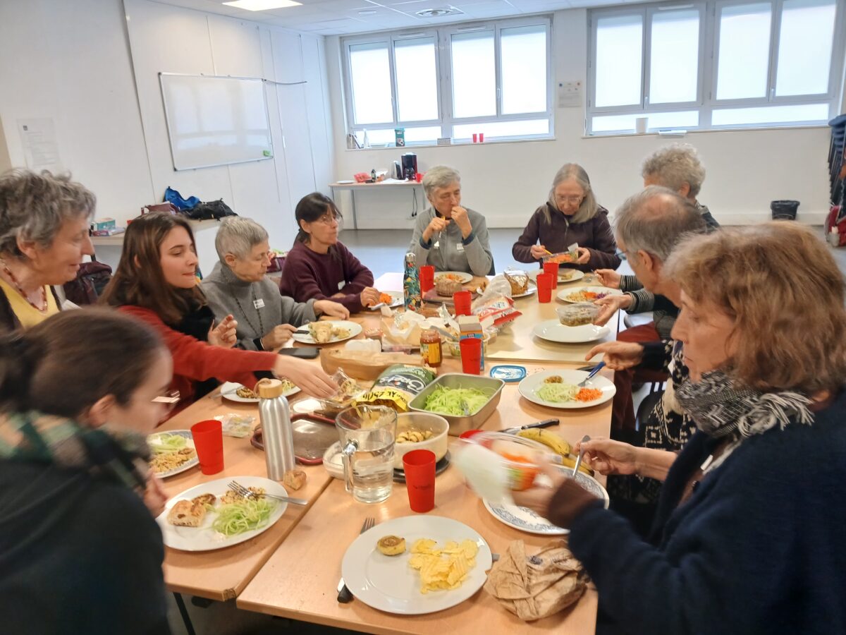 Avant le repas partagé (apprécié et convivial comme le montre la photo !), un travail en ateliers a permis d’approfondir quelques questions cruciales : les publics de nos actions, les lieux, les échanges avec les structures, la communication…